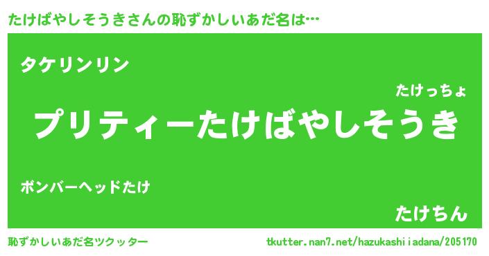 | 男性向けラノベタイトル風あだ名 | 『緋弾のタケバヤシソウキ』 |