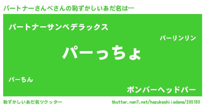 | 男性向けラノベタイトル風あだ名 | 『パートナーさんべ~年齢イコール彼女いない歴の魔法使い~』 |