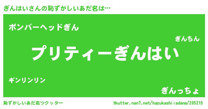 | 男性向けラノベタイトル風あだ名 | 『この素晴らしい世界にぎんはいを!』 |