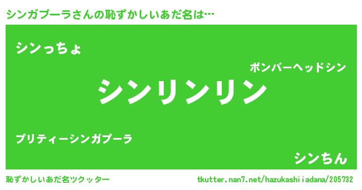 シンガプーラさんの恥ずかしいあだ名は… 『シンリンリン』『シンっちょ』『シンちん』 ツクッター #恥ずかしいあだ名ツクッター http://tkutter.nan7.net/hazukashiiadana/205732/
