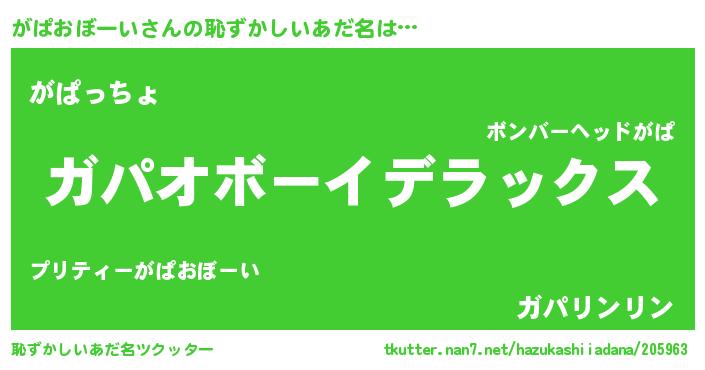 | 男性向けラノベタイトル風あだ名 | 『Re:がぱおぼーいから始める異世界生活』 |