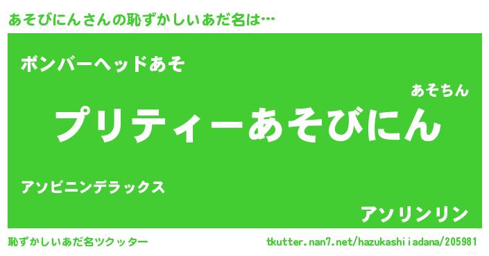 | 男性向けラノベタイトル風あだ名 | 『あそびにん~年齢イコール彼女いない歴の魔法使い~』 |