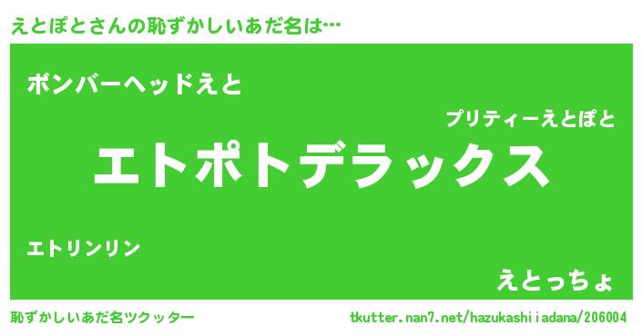 | 意味不明あだ名 | 『住所不定無職えとぽと(9歳)』 |