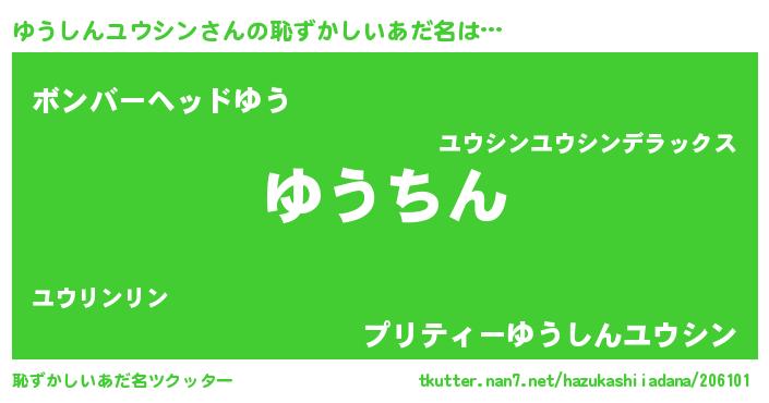 | 男性向けラノベタイトル風あだ名 | 『ゆうしんユウシンという概念が存在しない退屈な世界 』 |