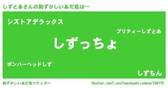 しずとあさんの恥ずかしいあだ名は… 『しずっちょ』『シズトアデラックス』『しずちん』 ツクッター #恥ずかしいあだ名ツクッター http://tkutter.nan7.net/hazukashiiadana/206175/