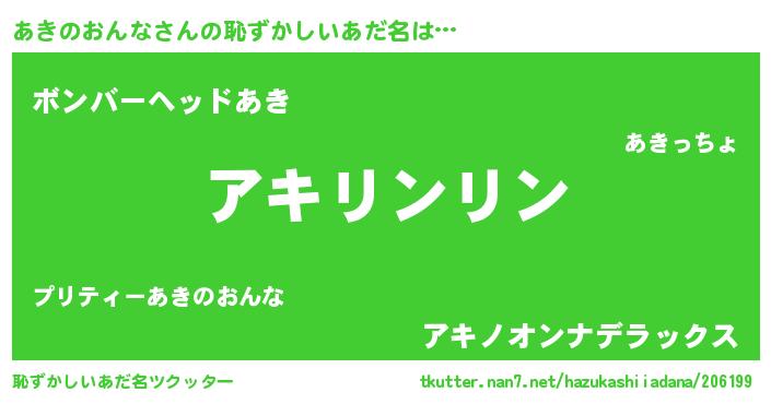 | 男性向けラノベタイトル風あだ名 | 『あきのおんなの嫁は女の子じゃないと思った?』 |