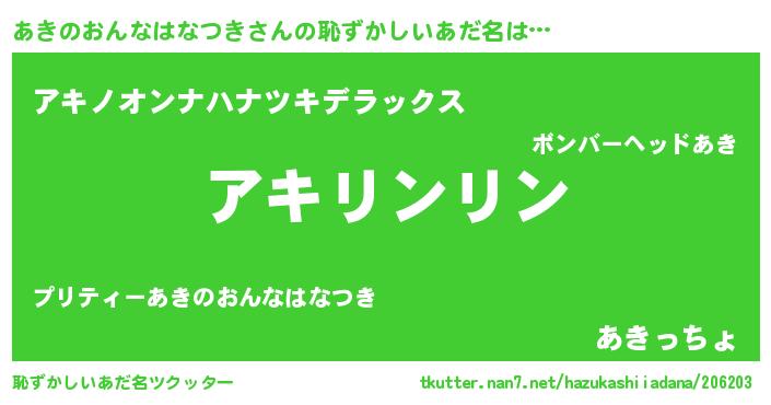 | ポケモン風あだ名 | 『ヒアキノオンナハナツキ』『アキゴンZ』 |