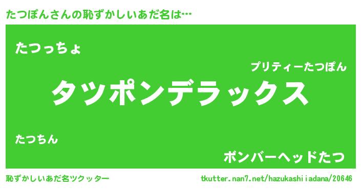 | 男性向けラノベタイトル風あだ名 | 『Re:たつぽんから始める異世界生活』 |