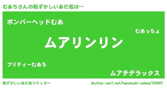 | 男性向けラノベタイトル風あだ名 | 『魔弾の王とむあち』『ムアチスレイヤー』 |