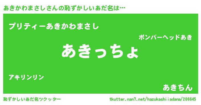 | 男性向けラノベタイトル風あだ名 | 『あきかわまさし~年齢イコール彼女いない歴の魔法使い~』 |