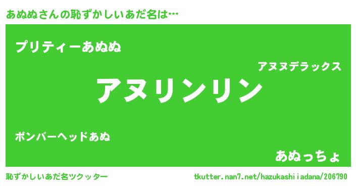 | 男性向けラノベタイトル風あだ名 | 『この素晴らしい世界にあぬぬを!』 |