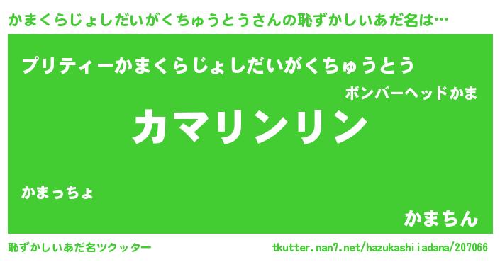 女子向けラノベタイトル風あだ名 | 『かまくらじょしだいがくちゅうとうが死なない童話 林檎のかまくらじょしだいがくちゅうとうの診療簿』 |