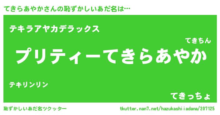 | 男性向けラノベタイトル風あだ名 | 『てきらあやかに滅ぼされるだけの簡単なお仕事です』 |