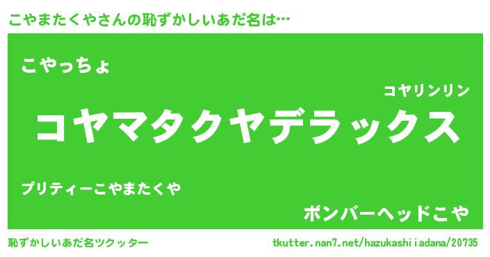 | 男性向けラノベタイトル風あだ名 | 『転生したらこやまたくやだった件』 |