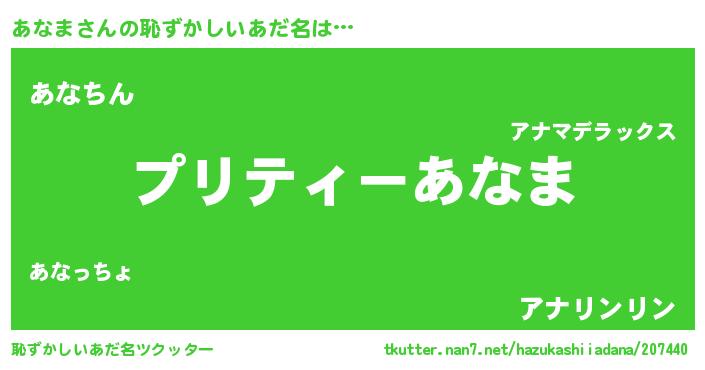| 意味不明あだ名 | 『ペロリンあなま』『永久保存あなま』 |