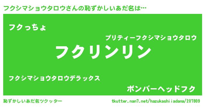 | 男性向けラノベタイトル風あだ名 | 『フクシマショウタロウの嫁は女の子じゃないと思った?』 |