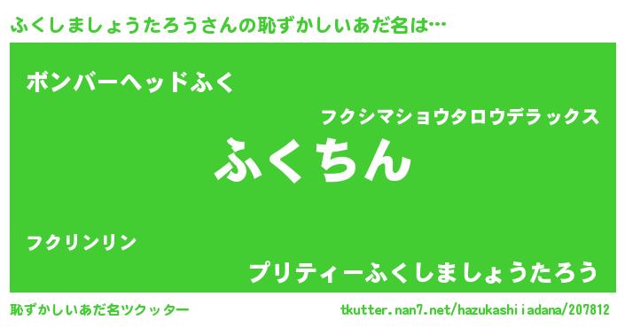 ふくしましょうたろうさんの恥ずかしいあだ名は… 『ふくちん』『ボンバーヘッドふく』『プリティーふくしましょうたろう』 ツクッター #恥ずかしいあだ名ツクッター http://tkutter.nan7.net/hazukashiiadana/207812/