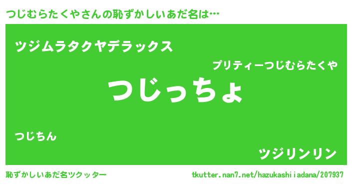 つじむらたくやさんの恥ずかしいあだ名は… 『つじっちょ』『ツジムラタクヤデラックス』『ツジリンリン』 ツクッター #恥ずかしいあだ名ツクッター http://tkutter.nan7.net/hazukashiiadana/207937/