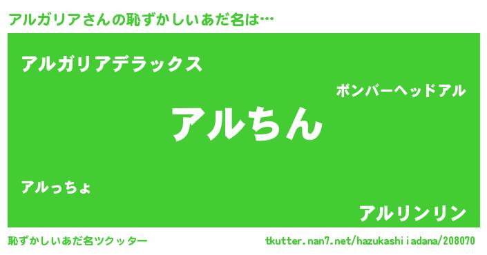 | 意味不明あだ名 | 『永久保存アルガリア』『自称アルガリア』 |