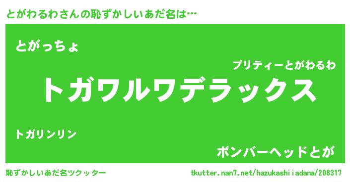 | 女子向けラノベタイトル風あだ名 | 『とがわるわなんてお断りですっ。』 |