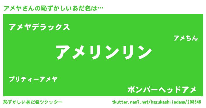 | ヘコむあだ名 | 『アメぷりん』『アメヤ(小並感)』 |