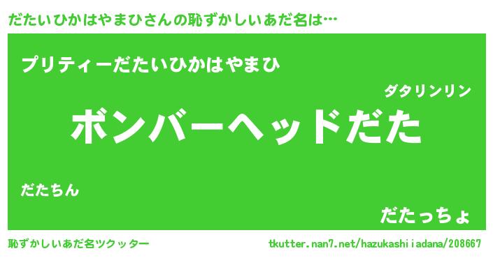 | 男性向けラノベタイトル風あだ名 | 『うちのだたいひかはやまひが世界を掌握している!』 |