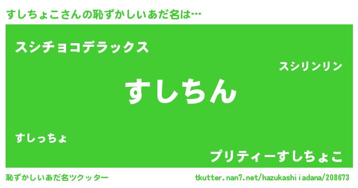 | 女子向けラノベタイトル風あだ名 | 『すしちょこの玉の輿計画!』 |