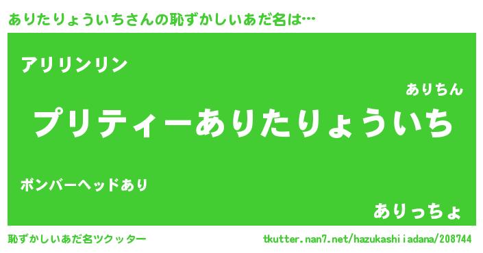| 男性向けラノベタイトル風あだ名 | 『アリタリョウイチスレイヤー』 |