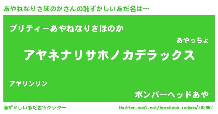 あやねなりさほのかさんの恥ずかしいあだ名は… 『アヤネナリサホノカデラックス』『プリティーあやねなりさほのか』『ボンバーヘッドあや』 ツクッター #恥ずかしいあだ名ツクッター http://tkutter.nan7.net/hazukashiiadana/208967/