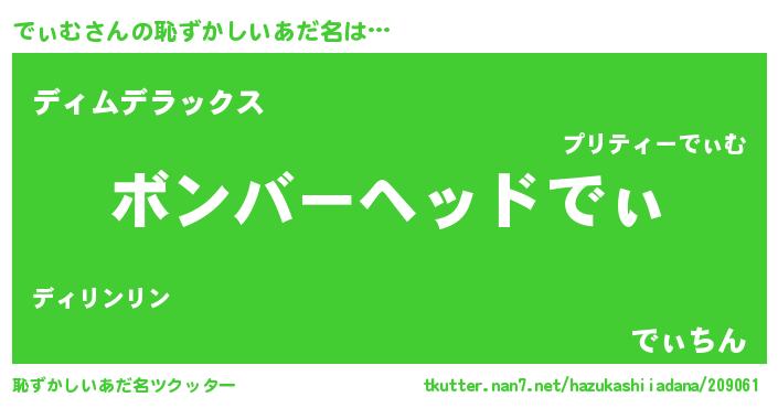 | 男性向けラノベタイトル風あだ名 | 『でぃむに滅ぼされるだけの簡単なお仕事です』 |