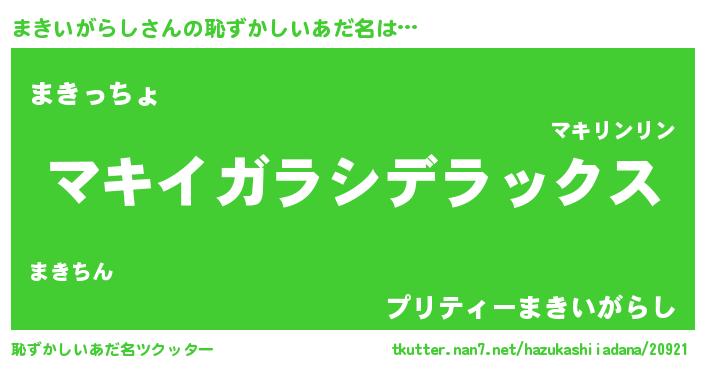| 男性向けラノベタイトル風あだ名 | 『Re:まきいがらしから始める異世界生活』 |
