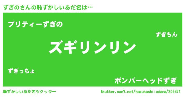| 男性向けラノベタイトル風あだ名 | 『緋弾のズギノ』『魔弾の王とずぎの』 |