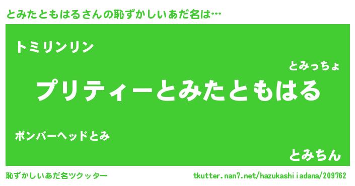 | 男性向けラノベタイトル風あだ名 | 『とみたともはる~年齢イコール彼女いない歴の魔法使い~』 |