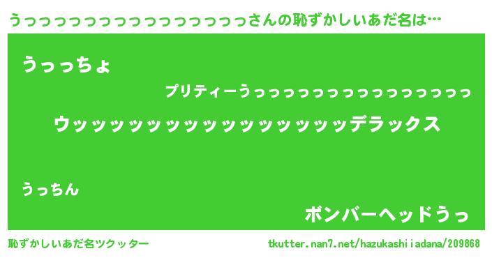 | 男性向けラノベタイトル風あだ名 | 『うっっっっっっっっっっっっっっっ~年齢イコール彼女いない歴の魔法使い~』 |