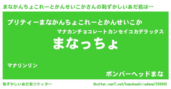 | 欧米人風あだ名 | 『まなかんちょこれーとかんせいこかクリステル』 |