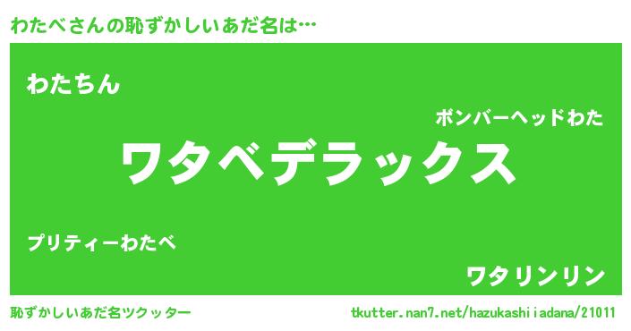 | 女子向けラノベタイトル風あだ名 | 『わたべの玉の輿計画!』『闇のわたべ』 |