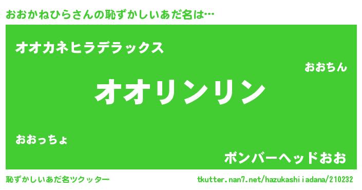 | ヒーロー風カッコイイあだ名 | 『魔戒騎士オオ』『愛の使者おおかねひら』 |
