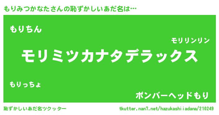 | 男性向けラノベタイトル風あだ名 | 『もりみつかなた~年齢イコール彼女いない歴の魔法使い~』 |