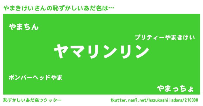 | 男性向けラノベタイトル風あだ名 | 『転生したらやまきけいだった件』 |
