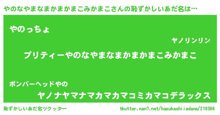 | 男性向けラノベタイトル風あだ名 | 『ヤノナヤマナマカマカマコミカマコアートオンライン』 |