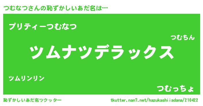 | 意味不明あだ名 | 『自称つむなつ』『ペロリンつむなつ』 |