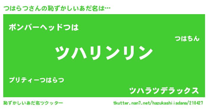 | ヒーロー風カッコイイあだ名 | 『炎刃騎士ツハ』『愛の使者つはらつ』 |