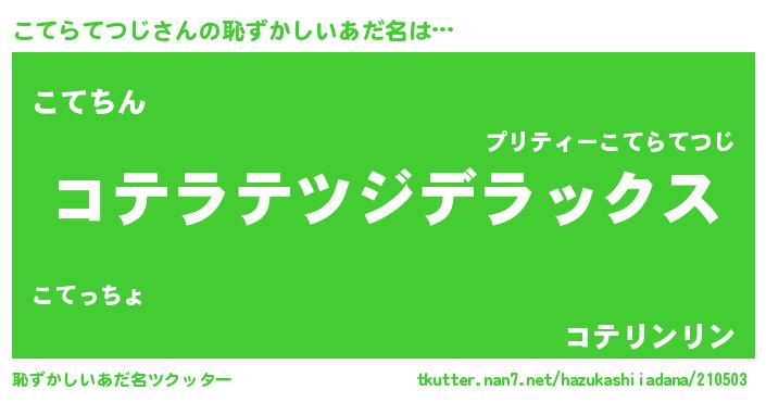 こてらてつじさんの恥ずかしいあだ名は… 『コテラテツジデラックス』『こてちん』『コテリンリン』 ツクッター #恥ずかしいあだ名ツクッター http://tkutter.nan7.net/hazukashiiadana/210503/