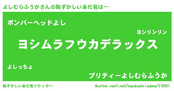 | 男性向けラノベタイトル風あだ名 | 『Re:よしむらふうかから始める異世界生活』 |