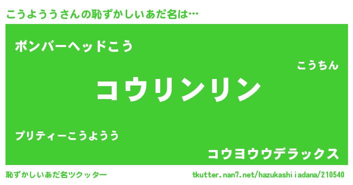 | 男性向けラノベタイトル風あだ名 | 『こうよううの嫁は女の子じゃないと思った?』 |