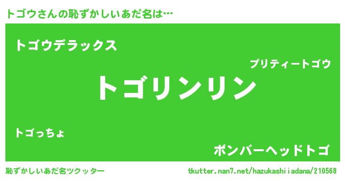 | 男性向けラノベタイトル風あだ名 | 『ダンジョンにトゴウを求めるのは間違っているだろうか』 |