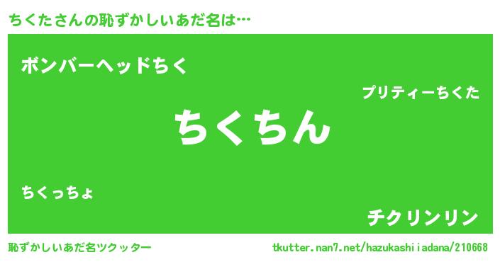 ちくたさんの恥ずかしいあだ名は… 『ちくちん』『ボンバーヘッドちく』『チクリンリン』 ツクッター #恥ずかしいあだ名ツクッター http://tkutter.nan7.net/hazukashiiadana/210668/