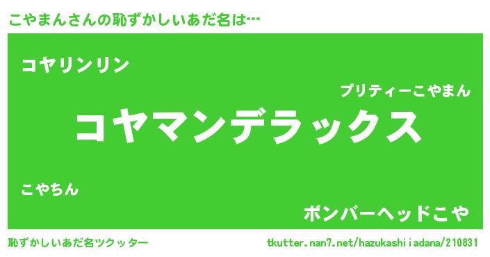| 意味不明あだ名 | 『なめこ科こやまん属』『自称こやまん』 |