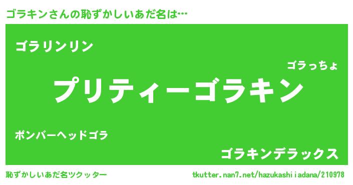 | 女子向けラノベタイトル風あだ名 | 『ゴラキンが死なない童話 林檎のゴラキンの診療簿』 |
