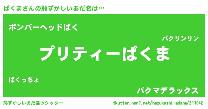 | 意味不明あだ名 | 『住所不定無職ばくま(84歳)』『自称ばくま』 |